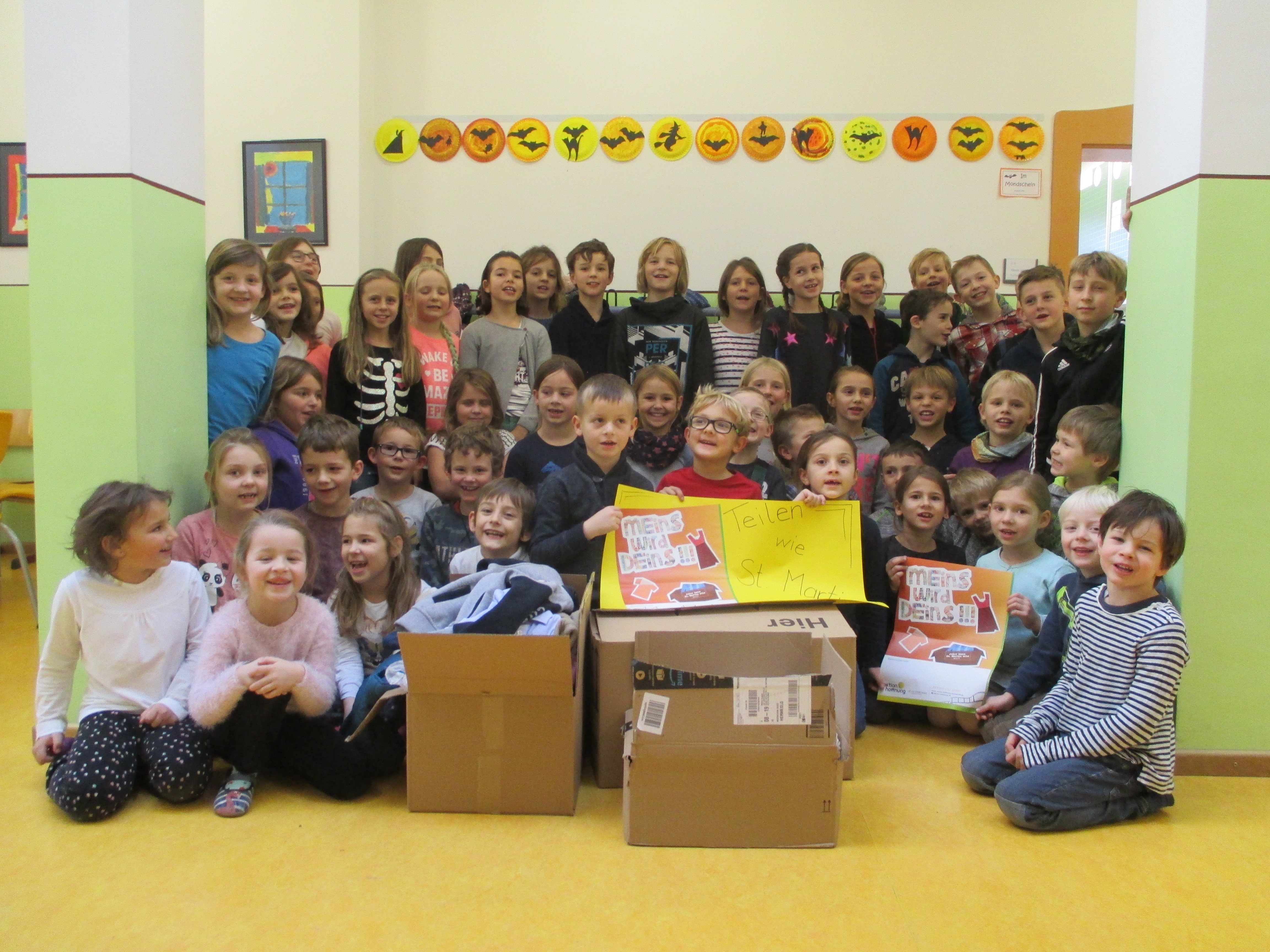 Auf Initiative unserer Religionslehrerin Frau Knorr-Strauch wollten wir die bekannte Geschichte vom Heiligen Martin in diesem Jahr nicht nur hören, sondern wir wollten wie er unsere Sachen teilen und anderen helfen. In der Sammelwoche vom 11.-17.11.2017 wurden etwa 35 kg Kleidung gespendet, welche in Kartons nach Ettringen geschickt wurden. Zusätzlich kamen noch unglaubliche 83,- € Spendengelder zusammen.
